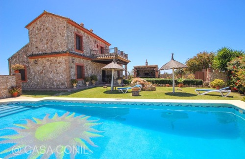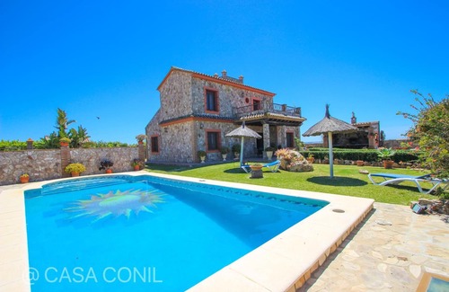 luxurious Villa with fantastic views, private pool and garden, 4 bedrooms sleep 8 -11, quiet, 10min to beaches of Conil, with free Wifi The very new "Villa Raquel" has been constructed in the Andalusian, rustic style. It is quietly situated in the hills surrounding Conil.