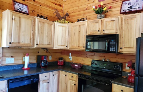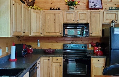 Gracie's Mountain Cabin has all the comforts of home- Wi-Fi, central heating & air, a beautiful gas fireplace with a stone surround and three HDTVs with satellite service. Open concept and plenty of sunlight. The kitchen is fully stocked with all of the utensils and equipment needed to cook or grill outside for delicious meals. We supply all the towels and linens for your comfort.