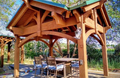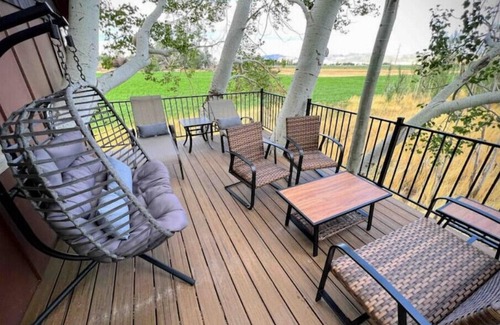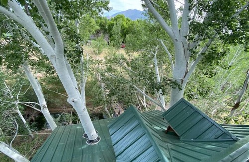 Make memories for a lifetime! Step into another world as you cross the 70’ sky bridge into the floating three story REAL TREEHOUSE, not fake, suspended in a giant tree! With rustic cabin feel, and giant tree trunks jutting from floor to ceiling. Relax and unwind taking in stunning views of the snowcapped mountains, the running stream and view wild birds (our resident Greathorned owls and Barn owls are a hit!), from two treetop fabulous decks. Indulge in a jetted hot tub, dine in a gorgeous pavilion and make s’mores in an awesome fire pit!