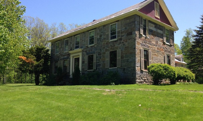 Five Bedrooms: 2 Queen Beds, 1 King Bed, 3 Twin Beds and one full. Bedding provided. Large Master Bedroom with private handicapped accessible shower/bath. Two more bathrooms, 1 with shower, one with claw foot tub and shower. Large common areas including Game Room with Foosball, Air Hockey, Ping Pong and TV. Great Room with smart TV large couches and stone fireplace with a wood stove. Sitting Parlor/ Birding Room next to dining area. Wireless Internet access through out home. Modern eat in Kitchen with all the modern appliances along with extra cold food storage. Dining service for12. Large Dining table to seat 12 indoors and large screened in back porch for 12 person dining. Ample lawn space, gardens and outdoor games provided. House is primarily stone and stays very cool in the summer months, fans are provided if needed. Cozy steam heat in every room for winter along with a wood stove in the great room for extra comfort in the winter