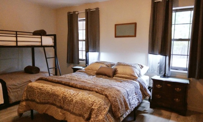 Experience Flint like a local on this 50-acre farm. This Farm Retreat includes 2 houses- a cabin and a farmhouse which includes 6-bedrooms and 3 bedrooms. Nestled in a serene setting, this property offers 5 queen beds, 3 bunk beds, 1 crib, and 3 twin beds for a superb stay. With amenities like WiFi, AC, and a washing machine, guests can relax and unwind in this soothing retreat. Three bathrooms with a hairdryer and shower ensure convenience for all. There are farm animals, nature trails, playgrounds, and a pond. Price listed is for 14 guests. We'll be available to answer any questions while you stay at our place.