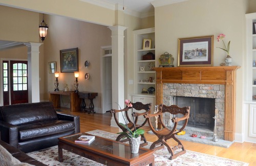 The farmhouse is a beautiful, traditional home sitting on 5.76 acres of rolling grass hills, hardwoods and pastures. Enjoy a little escape from the hustle and bustle of the city, yet you are only minutes away from it all! Early in the morning and as the sun begins to set, you are certain to see a family of deer playing in the back pastures. They have grown up on this farm, and love to jump the fence onto our adjacent property, The Rustic Farmhouse 451 Nichols Dr, Suwanee, GA, 30024, US