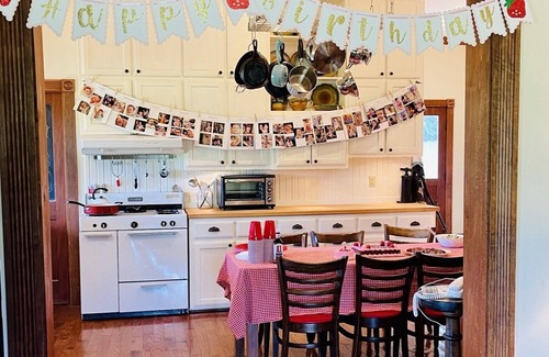 This beautiful family home is decorated with an eclectic mix of antiques and contemporary decor. It sleeps up to 12 in beds, with two bathrooms, a large well-stocked kitchen, a 1-acre fenced yard surrounded by woods and cattle pasture, and expansive living areas inside and out.