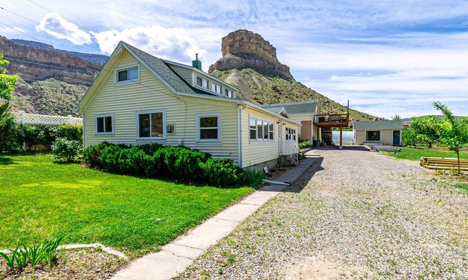 Enjoy a stay in Palisade just off the Fruit and Wine Byway with a hot tub and patio with a view of Mt. Garfield. 2 bed/1.5 bath house with 2 queen beds, 1 full bed, and a comfy pullout couch. 2 Nigerian dwarf goats will greet you in the yard.