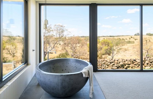 A sprawling well-equipped fully integrated chef's kitchen and butlers pantry allow guests to indulge in delicious home-cooked meals made from fresh, locally-sourced ingredients, while multiple indoor and outdoor dining areas provide space for all guests to gather together and enjoy time together no matter what the weather. Generously sized bedrooms, floor-to-ceiling windows with spectacular country views, a large stone egg bath, hydronic heating, split system AC, complimentary WIFI, and loads of other features come together to provide visitors to Fassway Farm a balance of style, function, luxury, and tranquility; creating a truly unique and unforgettable experience for those seeking a special retreat in the heart of rural victoria.