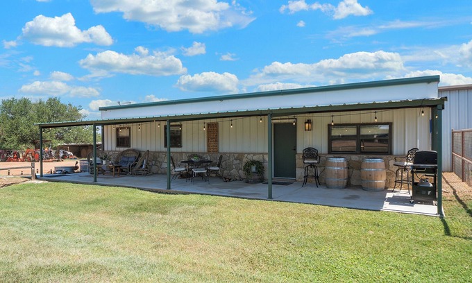“Stay a while” at the Faulkner Ranch in Llano, Texas. Come enjoy your peaceful getaway that you’ve been looking for at our beautiful ranch located just four short miles from downtown Llano! Throughout your stay you will enjoy the wonderful surroundings of ranch life and be able to relax in our completely remodeled and updated 2 bedroom/1 bath barndominium! This charming getaway includes a large 10 x 50 covered front porch completely furnished for your outdoor enjoyment and is equipped with a gas grill. We are here to provide a home away from home for those travelling alone or with horses. We can provide accommodations for up to 4 horses with our large indoor stalls (stalls will include an upcharge) and free use of our arena. During your stay, you may experience cattle being moved and worked, horses being trained and plenty of team roping practice. We thrive on this life and hope that you will find all of your wishes and enjoyment at our ranch.