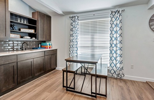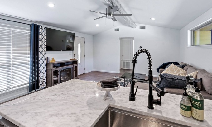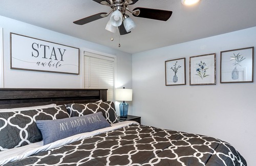 There is a king bed in one bedroom and a queen bedroom in the second. Both bedrooms have smart TVs. The living room is open to the kitchen and dining, so you’ll always feel connected with your guests. The house has a full size washer and dryer for any laundry needs. A fully stocked kitchen awaits you too!