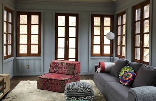 Our house is large and comfortable. We have books and pillows everywhere! Offer you fine toiletries and ALL furniture (except for some antiques ), linens, towels, kitchen items were purchased in nov or dec 2018. We have a SONOS system, WIFI, fire pit, new grill, outdoor furniture, sleds for the winter. Our home is unique as it was designed after a Swedish farm house with many interesting features including a car port, library, long hallways, rotunda, 131 acres to hike! It’s rooms are spacious and while we aim for luxury, everyone feels comfortable and welcomed! We have no neighbors but can buy fresh eggs or maple syrup 3 minutes away, can buy bbq 13 mins away at the Neversink general store, hike and go in the river right on our property!