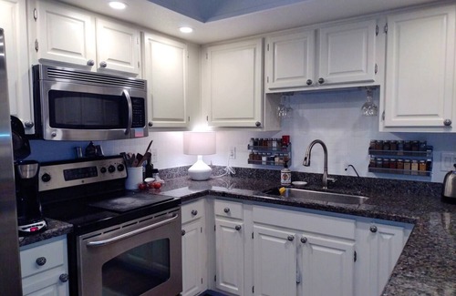 Discover this lovely 1-bedroom gem in Scottsdale. This amazing condo offers a restful base (backs onto walking/bike path) with both heating and AC. With a lovely bedroom (SleepNumber king bed) and ensuite bathroom with double sink vanity and washer/dryer, a fully equipped U-shaped kitchen (dishwasher) with granite counter tops, you'll feel right at home with 2 recliners and a large sofa in the living room along with an OLED cable TV. High speed internet. Electric fireplace. Whether you're exploring the area or relaxing on the back patio, this excellent property is the perfect retreat with 8 pools, tennis and pickleball courts for your enjoyment. A reserved covered parking space is a few feet opposite front door. No stairs. Welcome to the Southwest!