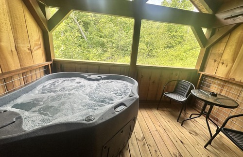 The Feelin Feisty cabin has log decor throughout. There is a couch in the living room along with end tables. The bedroom has a King bed with cotton quilt. Cell phone service is Great and the WiFi is super fast in this cabin. Most guest are able to use WiFi calling also while at these. The private, covered porch has a four person hot tub, two rocking chairs, and a table. This cabin has a longer range view in the winter time and has a wooded view in the summer time.. This cabin is pet friendly!!! The Feelin Feisty cabin is just perfect