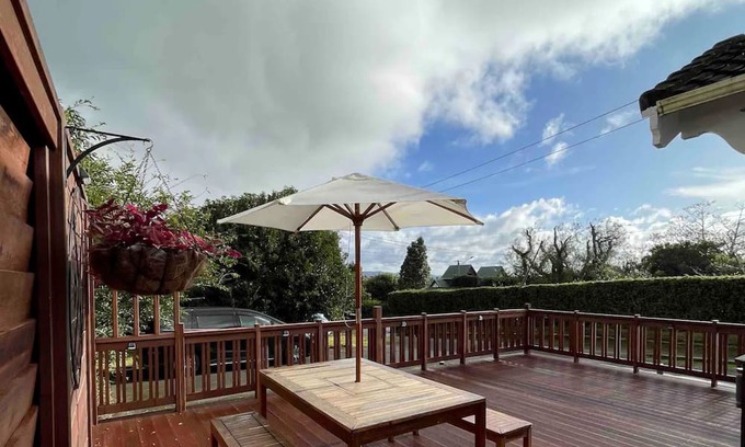 Large front deck with mountain view (outdoor furniture and outdoor dinning table).