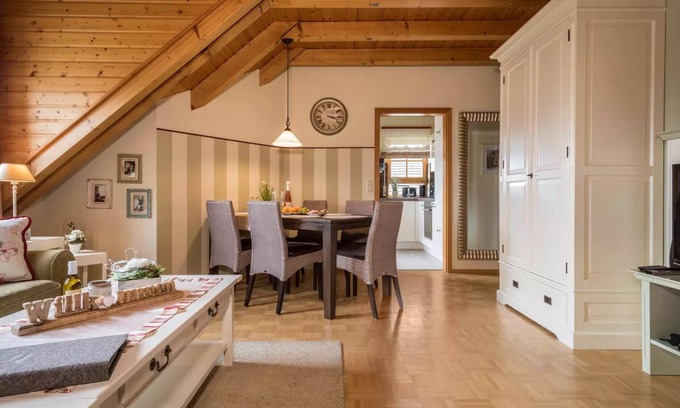 Die Dachgeschosswohnung wurde im exklusiven Landhausstil völlig neu eingerichtet. Dafür gab es bei der Klassifizierung verdientermaßen vier Sterne. Der helle Parkettboden und die geschmackvoll aufeinander abgestimmten Möbel verleihen der Wohnung ihre besondere Atmosphäre. Drei separate Schlafzimmer, ein stilvoller Wohnbereich mit Essecke, eine Echtholzküche, ein Bad mit Dusche/WC sowie ein großer Südbalkon bieten 2 bis 5 Personen reichlich Platz zum Wohlfühlen. In der originell geschnittenen Küche warten Backofen, Geschirrspüler, Mikrowelle, Kaffeemaschine und Toaster auf ihren Einsatz.