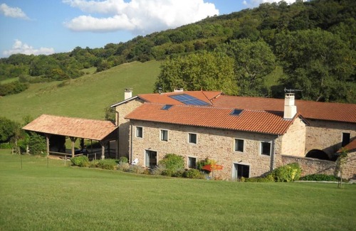 Exceptional countryside setting, at heart of the Monts d'Or protected area, less than 15 km from LYON downtown & 3 km from all shops. Splendid restored farmhouse from the 17th cent built of golden stone, also including a 2nd adjoining gite, 1 dwelling & the owners' second home. Eco-friendly features, renewable energy sources (solar powered water heater). Ground floor: living room, kitchen. Upstairs: 2 bedrooms (double bed) (2 single bunks + single bed), bathroom/WC. Attic (single bed). Card-operated mobile phone. Central heating (+40€/week from Mid-october to late April), outside room with shared tumble drier. Terrace, garden furniture, BBQ, sunbeds, many shared open spaces. Charge for pet: 15€/day.