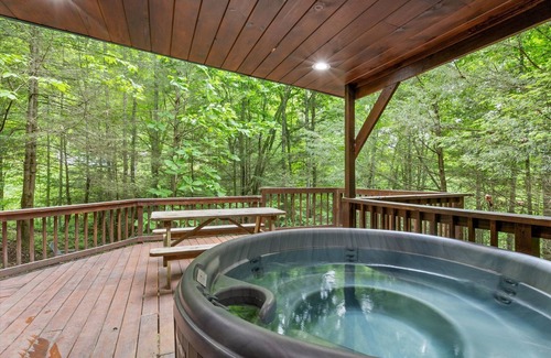 Step out to enjoy the sounds of the bubbling creek while sitting around the magical fire pit or soaking in the luxurious hot tub.