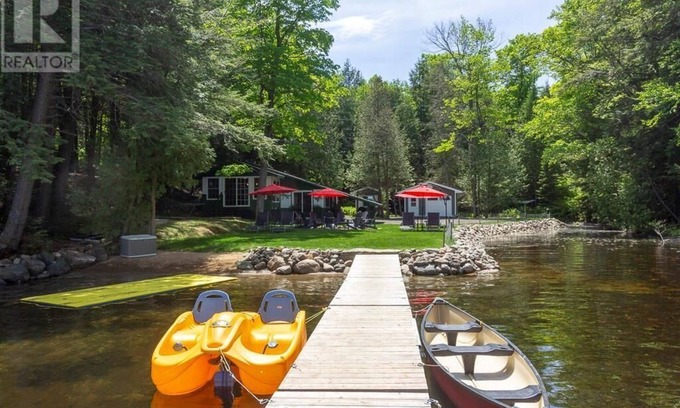 This lovely, cozy cottage is nestled in the privacy of its own cove on the large pristine lake of Chandos, only a five minute drive from Apsley, Ontario. The property is complete with a waterfall and a large, level water-front lot . A shallow, sandy entry is perfect for children; complete with a floating dock for deeper swimming. Fire pit available for family enjoyment. The clean and comfortable main cottage will sleep 6 comfortably - double bed, 2 singles , and a double pull-out couch. Dining room with stunning lake views seats 8 with a reading corner to enjoy a morning coffee. New 3pc bathroom. Living room complete with recliners, couch, card and board games, tv, DVD player, and a Wii U for rainy days ( a selection of DVDs/games available). Very functional and well-stocked kitchen is perfect for hosting family and friends. Full fridge/freezer, stove, microwave, water-cooler ( with some water to get you started), and a large new barbeque. Bonus Bunkie sleeps 3 (double & twin)this is considered 3rd bedroom. Rental comes with 2 kayaks, canoe, pedal boat, lawn/ lounge/water chairs, hammock, clothesline, picnic table, and large canopies for shade when needed.