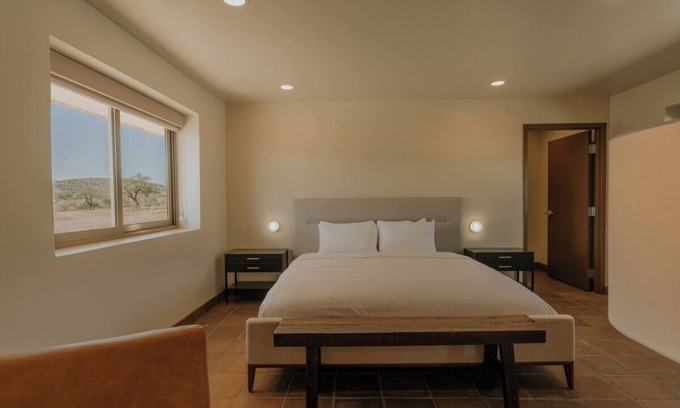 Surrounding an expansive lawn known as "The Field," this unit offers a well-appointed king and queen-size beds, private bath, original fireplace, spacious living room, full kitchen, and outdoor seating area. Immerse yourself in refined comfort as desert light and landscape complement the modern styling. Experience the air, light, and colors of the mountain desert, expansive outdoor areas, and the brilliant night skies of Chihuahuan Desert sky islands, evoking the spirit of the American West.