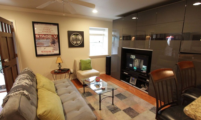 NO CLEANING FEE* (keep it clean). Luxury, corporate, high-end condo in a low-density (27 units) complex, most are 1-bedroom, next to Stacy park (similar to NY Central Park) w/free Stacy pool, walking distance to high-rated restaurants, music, The Boardwalk/river (less than 1/2 mile), downtown. Guests include A-list actors, corporate executives. Quality-furnishings, reserved parking. NOON CHECKOUT.