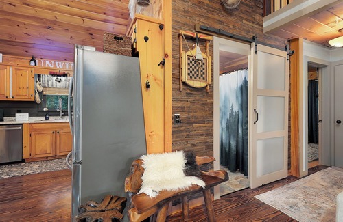 The primary queen suite offers privacy and comfort with a Roku TV, walk-in closet, and ensuite bath, while a second queen bedroom and cozy upstairs loft with another queen bed give your group plenty of space to spread out. A second full bathroom features a one-of-a-kind barrel vanity and rustic lodge décor, including a carved bear mirror that adds a playful, handcrafted vibe