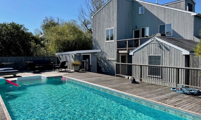 Lounge around the pool or walk one block to the ocean beach. Full-floor master BR suite w bathroom and work from home office space. Separate LRs on 1st & 2nd floors w streaming TV and high-speed wi-fi. Fire island family community, no cars. Walk/bike to stores, dockside restaurants and bars, playground, tennis courts, fishing pier. A/C in all bedrooms.