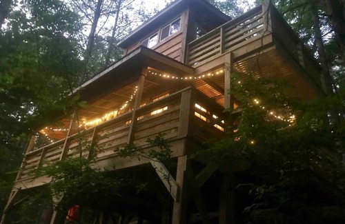 Firefly Bend Treehouse with its modern design is nestled on a hillside near a creek on the Hemlock Farm, where a small passel of animals and the main family reside in a log cabin. Please note, there are friendly, free roaming cats on the property as well as dogs at the main cabin. Please do not reach through or over any fences to touch, pet, or feed the animals. It is a private treehouse with a view of the creek and waterfall; a short walk takes you to the bathroom with running water and electricity. Rear of the property accesses the national forest for hiking in a serene and rarely used portion of the mountains.