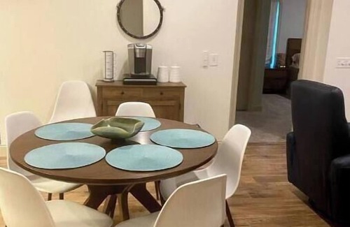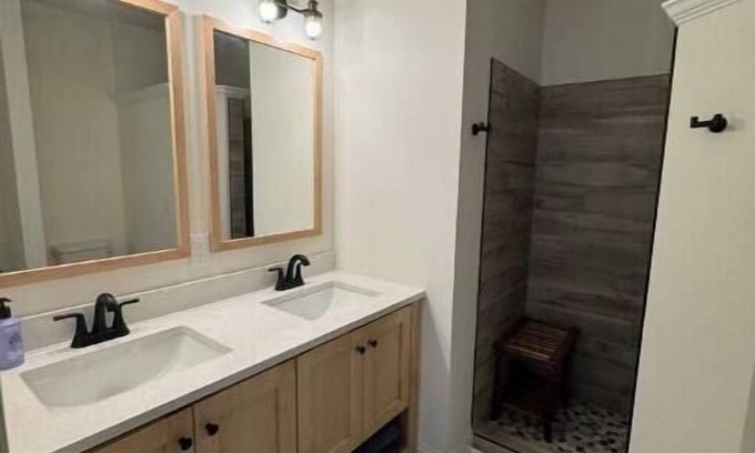 The home has a front primary suite and back primary suite, both include King beds and attached bathroom with two sinks, bidet, and walk-in shower. The back primary bedroom has sliders that lead out to the backyard.