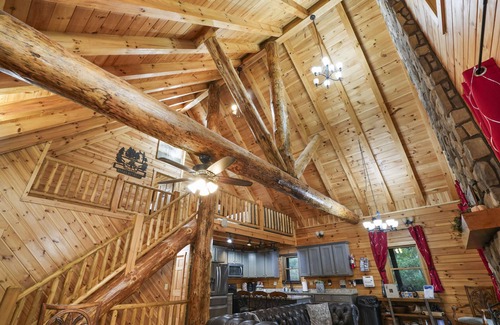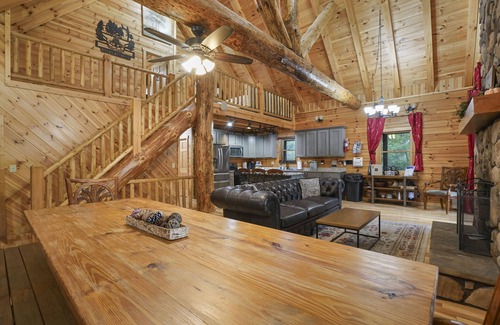 First floor features a stunning fully stocked kitchen with hickory cabinets, stainless steel appliances, granite counter tops, and island seating for 3. MASSIVE solid wood dining table for 10+. 2 piece powder room. Cathedral ceiling with open loft area. Floor to ceiling gas fire place. Convenient mudroom with EXTRA LARGE laundry. Master suite with a king size bed, Smart TV, electric fire place, and 4 piece bathroom makes the perfect romantic hideaway!
