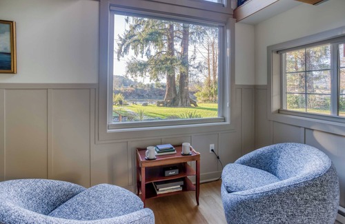 Beautifully updated with modern amenities that will enhance your stay, this charming two-story riverfront unit at the Nehalem River Inn promises quiet and relaxation on the North Oregon Coast. Located two miles from the charming town of Nehalem and ten minutes from Manzanita’s beach, this unit sports a kitchenette, a river view patio and deck, and a fantastic king bedroom suite up a spiral staircase. This romantic nest is enhanced by luxury bed linens, floor-to-ceiling windows, river views, and a bath with heated slate floors and a dual-head walk-in shower. The beautifully landscaped grounds lead to a fire pit next to the river, where you can lean back in Adirondack chairs, enjoying the flames and gazing at the stars and mountains.