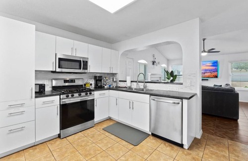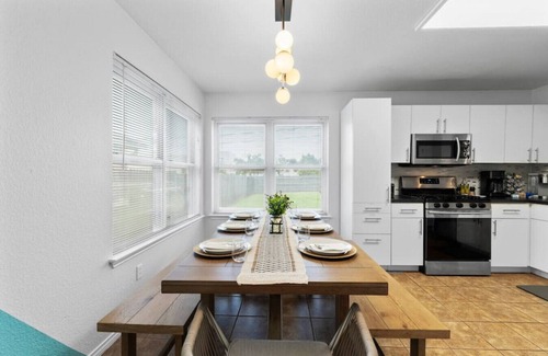 • KITCHEN & DINING: Cook with ease in the fully stocked kitchen, complete with modern appliances and cooking essentials. Dine at the table for 8, with extra seating for larger groups. Prefer dining out? Great restaurants are just minutes away.