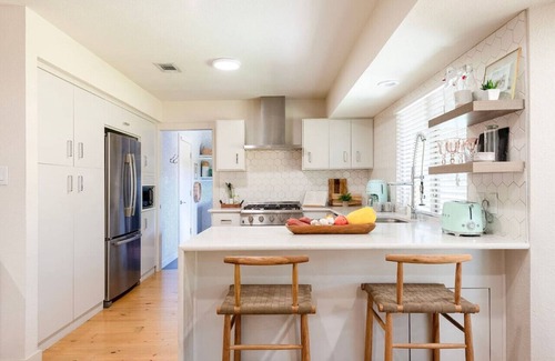 This 1,800 sq. foot, 1970s home has been recently renovated with all the modern luxuries. Guests will love the open layout coupled with a mix of clean and interesting design.