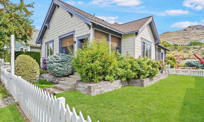 The cottage is encircled by a quaint white picket fence, perfect for keeping your furry friend safe. Inside, the space is designed to offer comfort and style. The newly updated kitchen boasts modern appliances, including a coffee maker and a Ninja blender for your smoothie or margarita cravings. Enjoy meals at the oversized dining table, or take advantage of the BBQ and outdoor cooking utensils for a delightful al fresco dining experience.
