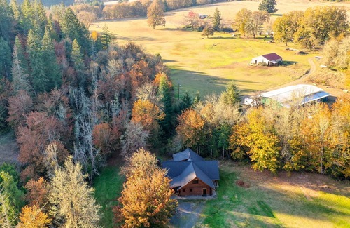 Modeled after a historic wilderness log home, our family cabin is a blend of modern and rustic architecture running on geothermal energy. Featuring 25-foot vaulted ceiling, the main family room offers a relaxing lounge perfect for a wine hour. This beautiful log cabin is truly an unforgettable retreat. Nestled in the heart of Umpqua Valley and resting on the banks of a babbling creek, you will be overwhelmed at the stunning sights and sounds this location has to offer. “The Cabin”, as we call it, has been a family treasure for almost 15 years! Perfect for hosting family vacations, group retreats, or a couples getaway.