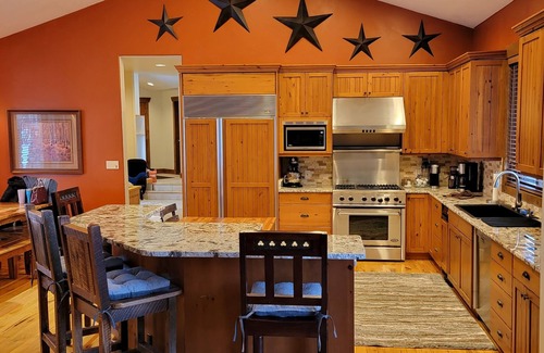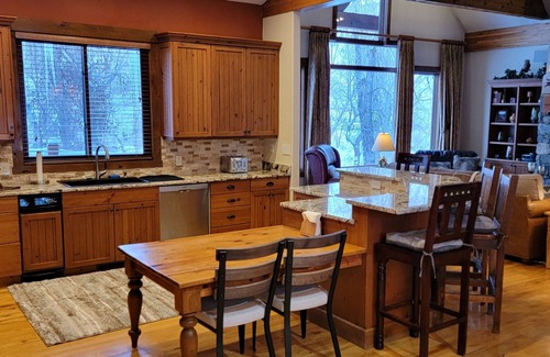 Rustic and elegant, with vaulted ceilings and pine beam accents, the main living space will make any sportsman feel like the king or queen of the Eagle River. Look out over the treetops and talk up your latest catch as you sit in front of a crackling fire in the stone fireplace. The wet bar off the sitting area is ideal for a post-fishing trip drink.