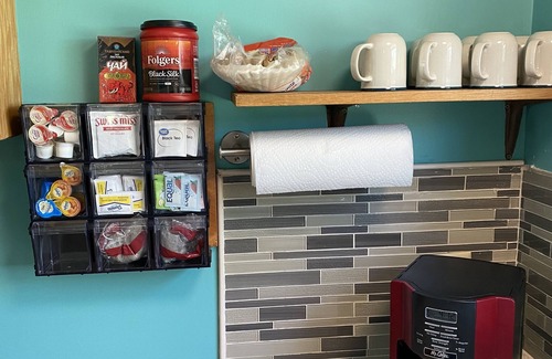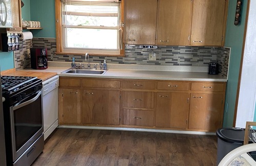 Full eat-in kitchen with appliances and accessories. (refrigerator, gas stove, microwave, dishwasher, coffee pot, toaster, crock pot, cooking utensils, pots and pans, dishes, silverware)