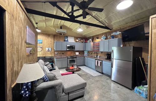 This is what we call our fish camp. There is no roughing it at fish camp. We have full kitchen, W/D and tvs in each room. Wireless internet access is free. Out on the patio you can enjoy the breezes in the evening while grilling your fresh catch or a nice beef steak. Attached to party patio is what we call the Cook Shack. It has a queen bed and full bed with TV in room. Also has a full kitchen and bathroom. Perfect for two separate families to each have their privacy. We have covered parking for your boat and a fish cleaning station. Also attached to property is 4 50amp RV spots.