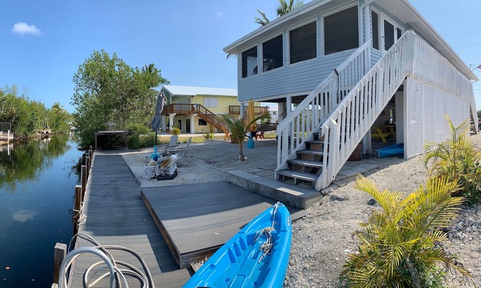 *WINTER 2025 now available!!! (Dec 2025 - Mar 2026). Book quickly! Cozy, clean, canal front home is located in a quiet, family friendly, National Key Deer Refuge. 3 bedroom, 2 baths with screened in porch, and plenty of outdoor living area underneath. Master bedroom with king bed with attached bathroom. One guest bedroom with queen bed, and the other with 2 twins, 2nd bathroom conveniently located inbetween. Fully equipped (recently updated!) kitchen with attached washer/dryer combo. Dining area (seating for 6) additional table for 4 on screened in porch. Additional amenities include Wifi, Netflix, Amazon (movie purchase options available) and basic cable, kayaks with rollers, 2 adult and 1 child bike, 50' composite dock, large fish cleaning table, plenty of outdoor seating with shade umbrellas and hammock, shed is welcome to guests with beach supplies, kiddy pool, few fishing poles/lobster nets, and such. Propane as well as charcoal grill on site for cooking your fresh catch. Short 3 minute boat ride to Pine Channel, then boating access to Gulf or Atlantic. Home has private undeveloped lots in front and to the side, other side is fenced for additional privacy. Although we can’t guarantee, the home directly behind us is usually vacant with 1 owner who does not rent. Beautiful quiet area with beautiful walks and biking, small shops throughout the island, cool little restaurants....off the beaten path.