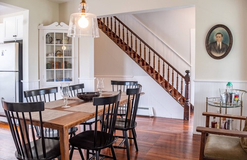 Spacious is an understatement at Five Acres Farm. Picture windows throughout the living room both illuminate the space and offer up bucolic view from the comfortable seating. Tucked into an alcove, there is also a cozy sectional to cuddle up on while watching your favorite movie. Across the entryway you'll find the dining room with seating for six and easy access to the kitchen or patio. This open layout makes indoor or outdoor dining a breeze. A full bathroom between living and dining areas rounds out the first floor.