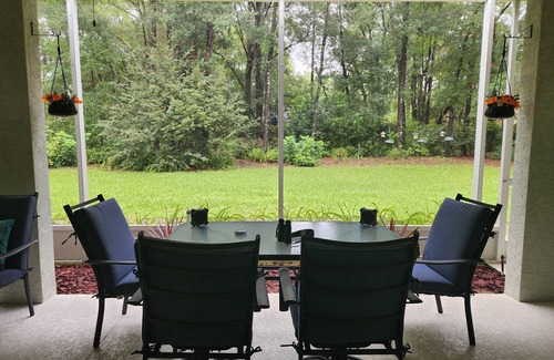 The living room, dining room, and well-equipped kitchen are the hub of the house. Sliding glass doors lead to an expansive lanai that is screened and also covered, no blazing sun or bugs. A gas grill, patio furniture, and loungers are ready for your use. The backyard view is woodsy and private; neighbors are at a distance. Enjoy your morning coffee watching the birds. At the tree line, there is a walking/bicycle path that traverses the community.