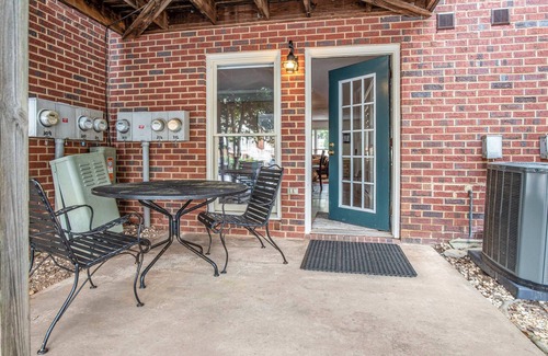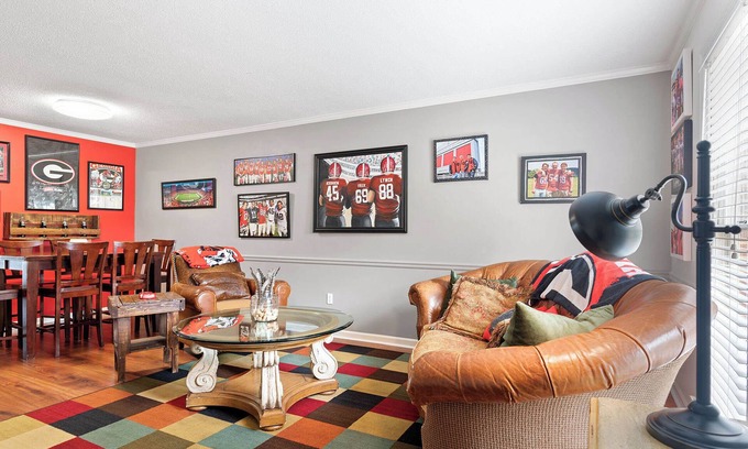 Decorated in an upbeat yet sophisticated UGA theme, you’ll be surrounded by great memories and fired up to cheer on the Dawgs during whichever sporting event you’re in town to witness. Step through the front door into a cozy living room with comfortable sofa seating with mounted smart TV – a setting perfect for pregaming before heading out for the day’s adventures. A dining room table with seating for 6 can play host to a raucous round of games as well as serve as a formal setting for mealtime. Round the corner into the spacious kitchen, well-equipped with all standard appliances, cookware, and dining ware for when you need to whip up a quick bite on the go or try out takeout from a local restaurant. Make a stop at the coffee maker and take your cup onto the quaint back patio to enjoy a quiet morning at the café table for 2.