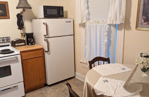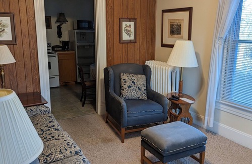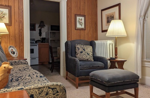 Comfortable living room, equipped kitchen , library/computer room and twin beds for the bedroom. You can have coffee on the attached porch overlooking the woods. Later walk downtown through the Victorian neighborhood and enjoy the homes and gardens. Only four small blocks to downtown to shop, eat, and enjoy the ambiance and friendliness of a thriving downtown, You will be glad you stayed and we'll be glad to meet you.