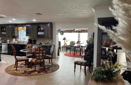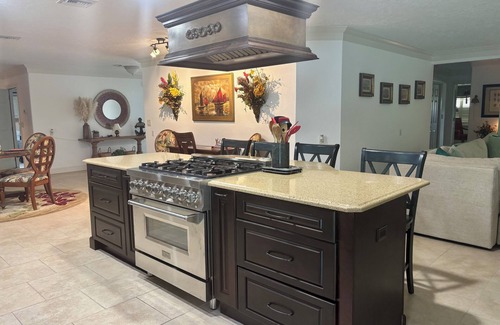 Our home has four bedrooms, two well-appointed bathrooms, a solar heated/screened, swimming pool, large outdoor kitchen with high-end gas barbeque, Smart TV, granite counters and sink. A gourmet indoor kitchen with new commercial appliances to include ice maker, wine cooler, dishwasher and commercial grade gas stove. There's a large dock for your boat or fishing and a fenced yard for furry friends.