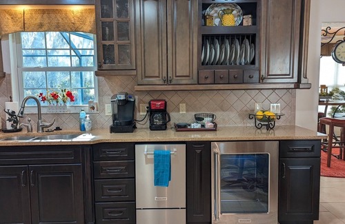 The gourmet kitchen has a built-in wine cooler, large ice maker, dishwasher, commercial grade gas stove, large refrigerator and an assortment of small appliances. The dining room table seats 6. There's additional seating at the kitchen island for four. We do not skimp on the small stuff. If you need it, it will be there!