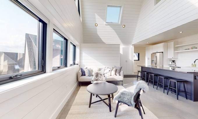 This two-story cabin is part of a small community of A-frames nestled on Saddleback Mountain, offering lovely views looking down toward Rangeley Lake. Those serene views and an abundance of natural light fill the whole house, thanks to lofty ceilings, well-placed skylights, and white shiplap walls.