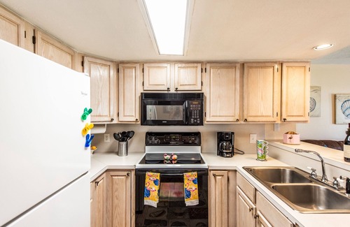 Unit #123 has a King bed in the master bedroom and a Queen bed in the second bedroom. There is a pull-out sofa sleeper in the living room perfect for children. The room sleeps 6 people maximum. Fully stocked kitchen makes dinner easy to prepare but there is also B-B-Que pit's behind the pool if grilling is your choice. A TV is provided in each bedroom and in the living room. Free wi-fi too! This unit also has a washer and dryer in the unit for your convenience.