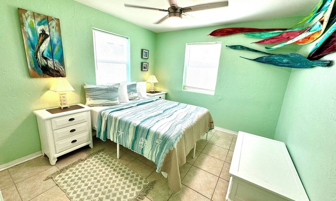 Pet friendly, 2 bedroom tropical bungalow that's 5 minutes walking distance down our street to the beach walkover. Beach cart & towels are available for use. Colorful and comfortable, this house is a little respite from the world. NEW King & queen beds with outdoor table and grill. Super close to Publix, restaurants and beach parks. We love dogs and accommodate for them with both a fence in backyard and front patio area.
