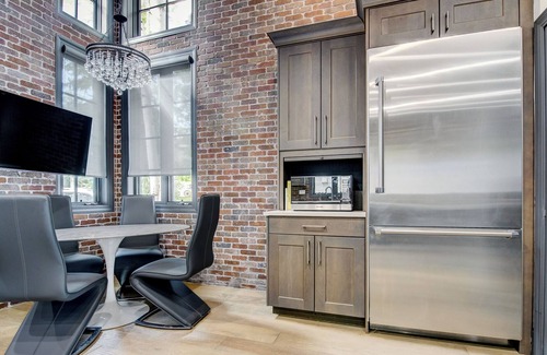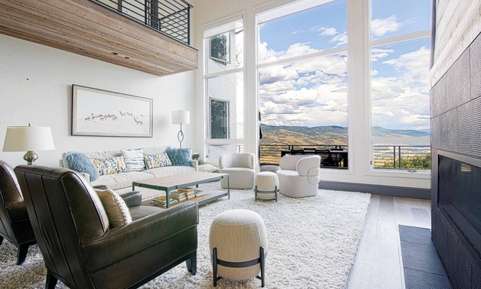 Upon entry, you'll be met with a bright interior and a cozy atmosphere throughout the well-appointed living space. The breathtaking view from the living room is unlike any other, with oversized windows showcasing the mountains and valley. Relax and make yourself at home by resting on the plush furniture, admiring eclectic art, curling up with a good book by the fireplace, or watching a movie marathon in the premium recliners on the large TV. The kitchen tastefully marries industrial and rustic design with its sophisticated layout, boasting state-of-the-art stainless-steel appliances, ample cupboard room, and a formal dining table.