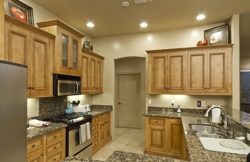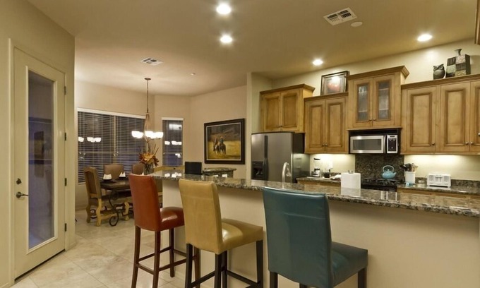Walking into the home you are welcomed into the home with tasteful southwest decor, a cozy but spacious living room with a gas fireplace, a 60-Inch flat screen TV, Apple TV, BluRay Player, and a very comfortable sofa, love seat and club chair. This room has plenty of natural lighting, reading lamps next to the sofa and chair, ceiling fan, and recessed lighting for added warmth and ambience.