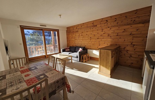 This 40 m², 6-person flat in the La Chanalette residence in Vars Saint Marcellin comprises a bedroom with a 140 cm double bed, 1 bathroom, 1 separate toilet, a bunk bed, a sofa bed in the living room, a kitchen equipped with a 119 L fridge, a 4-burner hob, an oven/microwave (with a Nespresso coffee machine and a kettle), a dining/living area and a south-facing terrace with stunning mountain views.