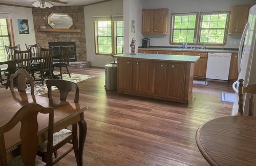 The Lake House has a very large screened in porch with ceiling fans, dining table, grill, full size ping pong table, and arcade sized air hockey table. The inside features an open floor plan with a large island and lots of tables. There is all new flooring throughout the house. Wireless internet, a flat screen tv with Roku for streaming, and a reclining sofa. The three bedrooms can sleep 7 privately. In addition there is a futon that makes a full size bed, and a queen air mattress available. Linens and towels are provided. The kitchen is stocked with everything you should need except the food. A large refrigerator, stove, oven, microwave, dishwasher, water cooler, washer and drier. The property is handicap accessible with a mostly flat lot and ramp into the house. However, the dock, back porch and bathrooms are not accessible to a wheelchair.