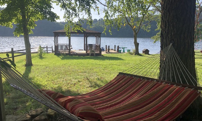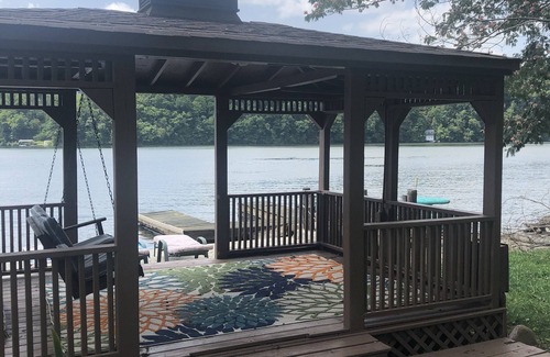The Lake House sits on a relatively flat lot that is completely fenced in. It features a gazebo by the water with a porch swing. There is a sunning patio with lounge chairs and a concrete table by the dock. There is a concrete entrance into the water that is shallow and great for children to play in. Children will also love the ninja warrior course line in the trees. The wooded area has a firepit with chairs, a picnic table and a hammock.