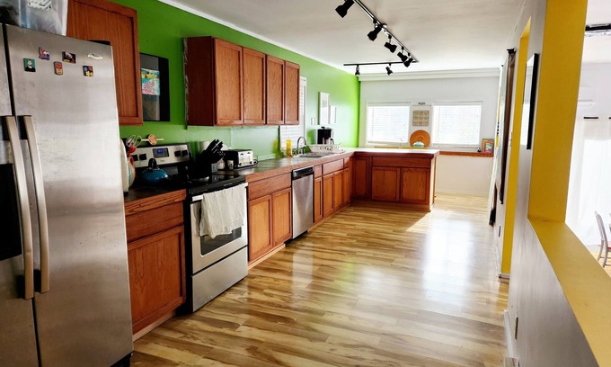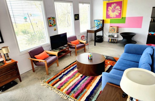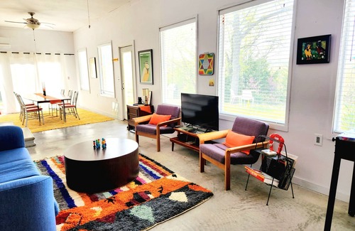 The interior of the home is bright, clean, colorful, and fun. The large, well-appointed kitchen is a perfect place to cook up whatever you fancy. The roomy and bright living and dining area offers gorgeous views of the lake, plenty of seating, Roku smart tv, dvd player, vintage pinball machine, and lots of games and books. Oh, and the internet is super high speed fiber-optic broadband, so you can seemlessly stream without buffering!